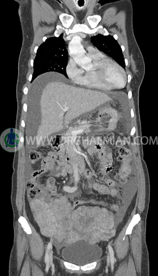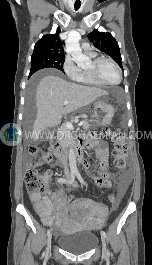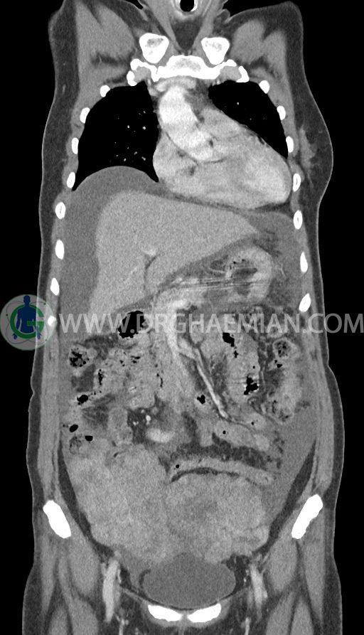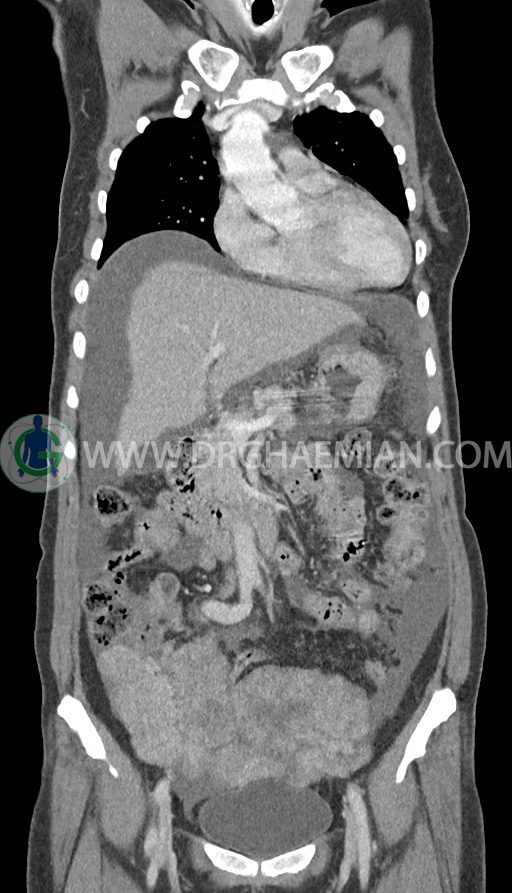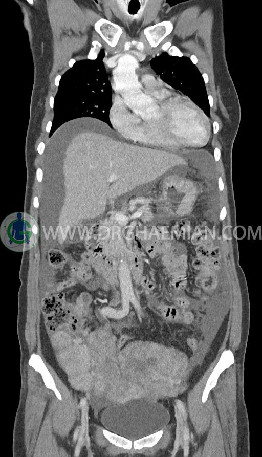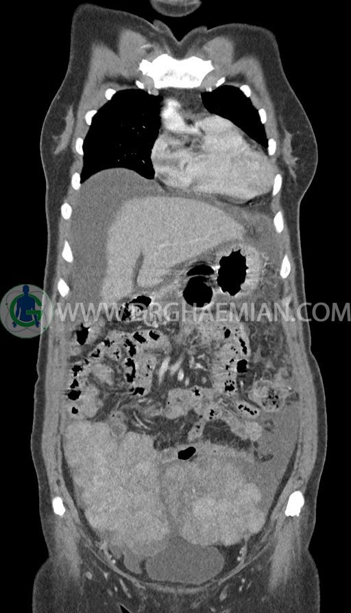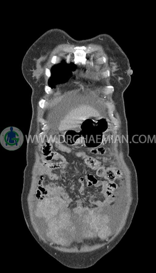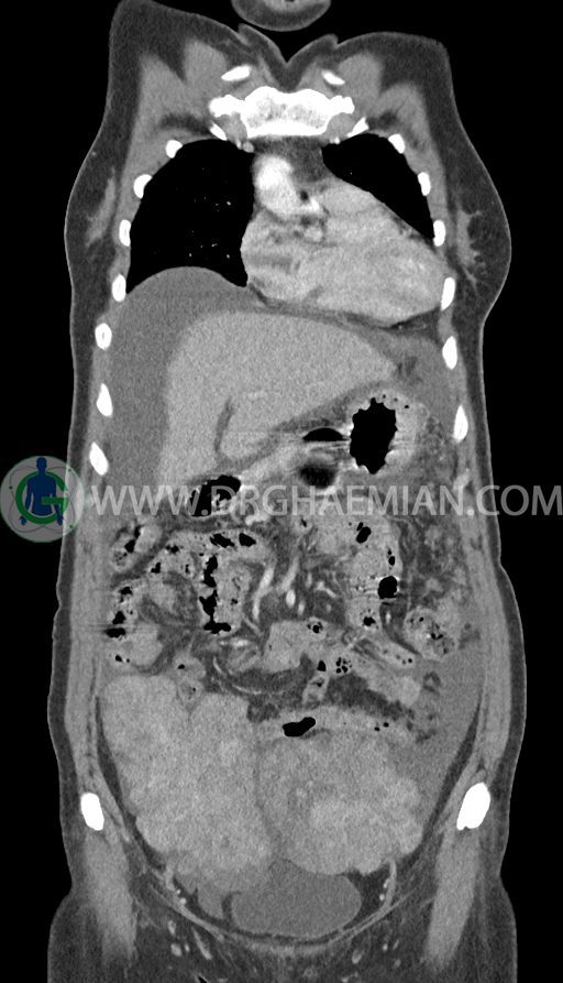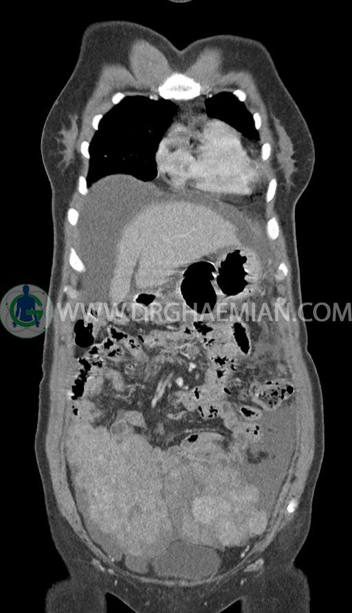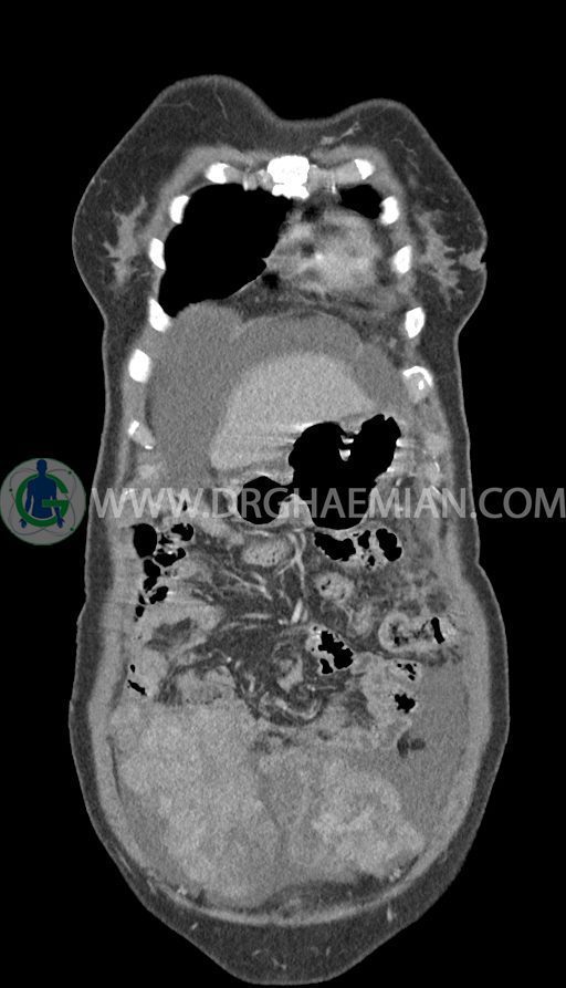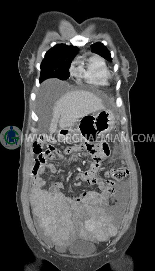سی تی اسکن شکم و لگن با استفاده از اشعات ایکس تصاویر عرضی از ناحیه شکم و لگن ایجاد میکند. در این کیس تومور کوکنبرگ، آسیت شکمی، کارسینوماتوز پرینوئن، پلورال افیوژن و … دیده می شود.