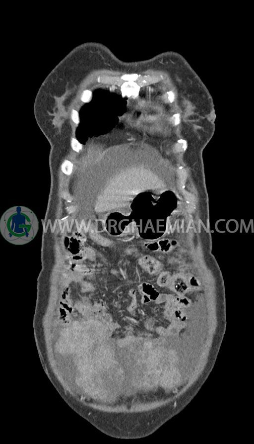 در سی تی اسکن اسپیرال ریه ها و مدیاستن، شکم و لگن با کنتراست وریدی (مولتی دیدکتور 16 با مقاطع ظریف و بازسازی کرونال):