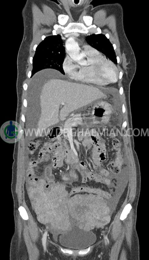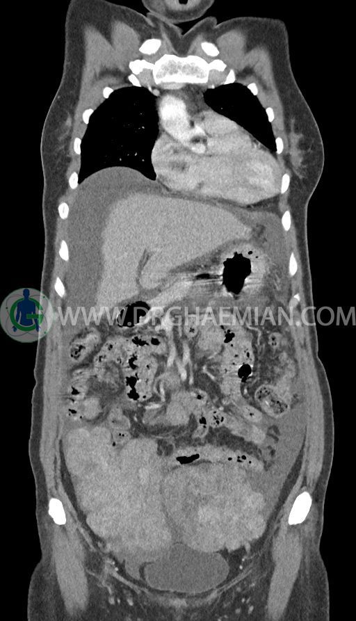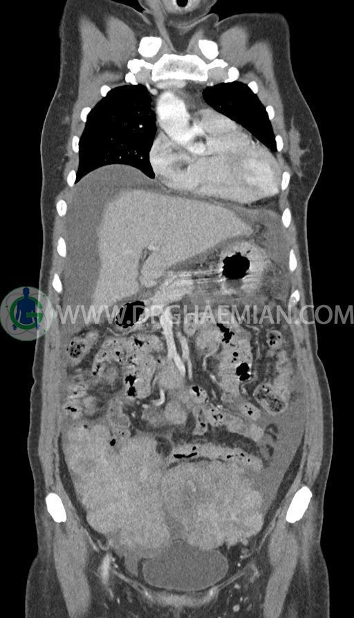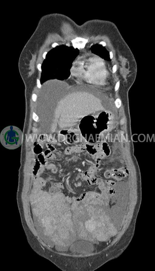 -enlargement قابل توجه هر دو تخمدان همراه با اینهنسمنت هتروژن به سایز (TxAPxcc)106x73x85mm در سمت چپ و 82x57x136mm(TxAPxcc) در سمت راست به نفع متاستاز دوطرفه تخمدان (krukenberg tumor)