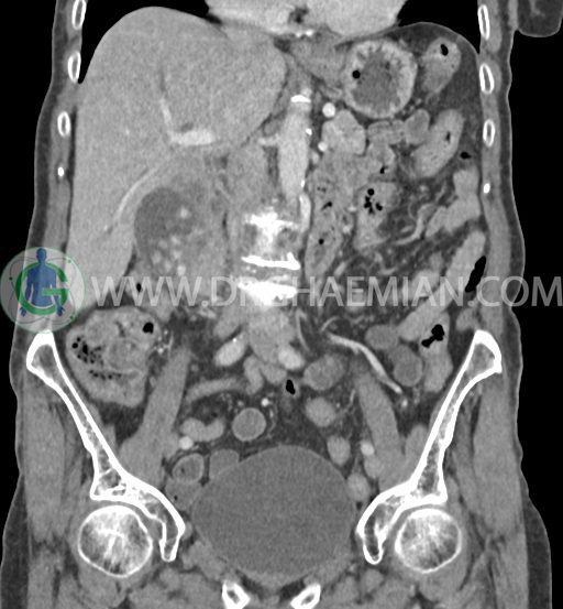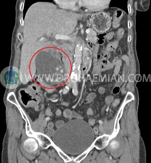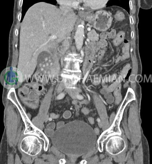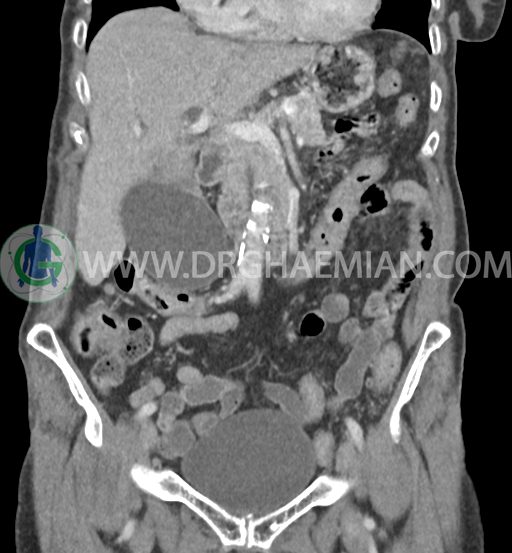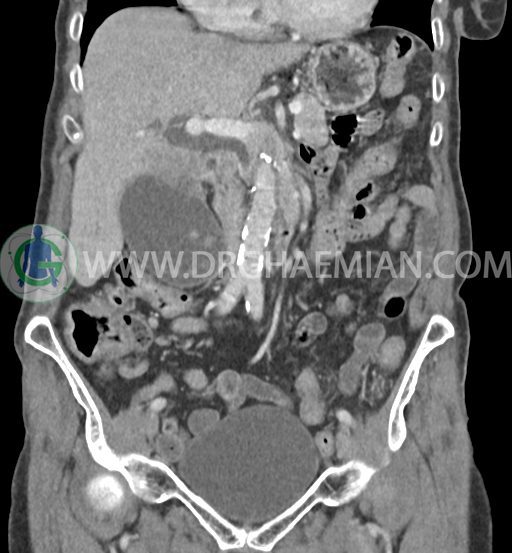 سی تی اسکن شکم و لگن با استفاده از اشعات ایکس تصاویر عرضی از ناحیه شکم و لگن ایجاد میکند. در این کیس سرطان مجرای صفراوی (کولانژیوکارسینوما)، توده در کبد، کیست کورتیکال در کلیه چپ، کلسیفیکاسیون دیواره آئورت و … دیده می شود.
