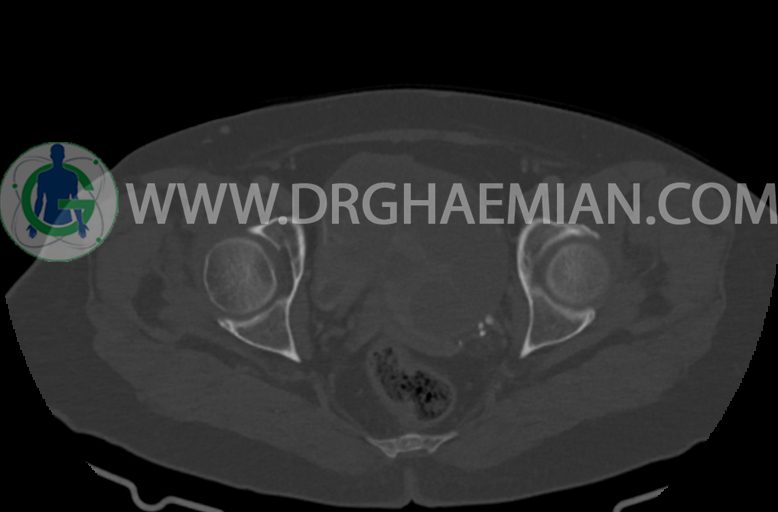 سی تی اسکن شکم و لگن با استفاده از اشعات ایکس تصاویر عرضی از ناحیه شکم و لگن ایجاد میکند. در این کیس موسینوس کیست آدنوما، شواهد هیسترکتومی، ضایعه در سمت راست لگن، کیست در کبد و … دیده می شود.