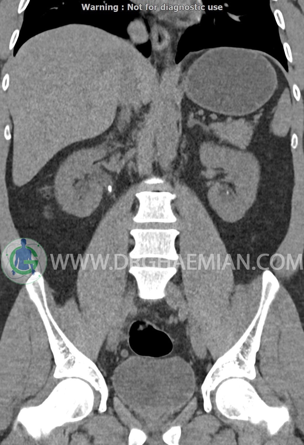 در سی تی اسکن اسپیرال شکم و لگن بدون کنتراست (مولتی دیدکتور 16 با مقاطع ظریف و بازسازی های ساژیتال و کرونال):