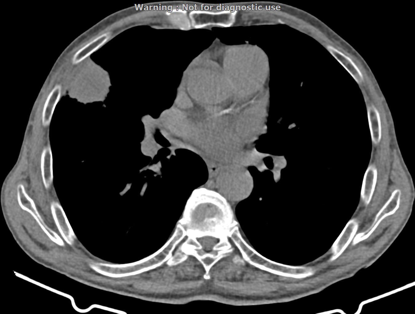 – ضایعه ی solid/lytic با قسمت سنترال cystic و جداری ضخیم و نامنظم به ابعاد 35x31mm در ناحیه ی ساب پلورال RML مشهود است که در درجه اول به نفع یک متاستاز نکروتیک (با توجه به شرح حال تومور مثانه ) و یا ضایعه نئوپلازیک اولیه ی ریوی می باشد. CNB جهت بررسی بیشتر توصیه می شود.