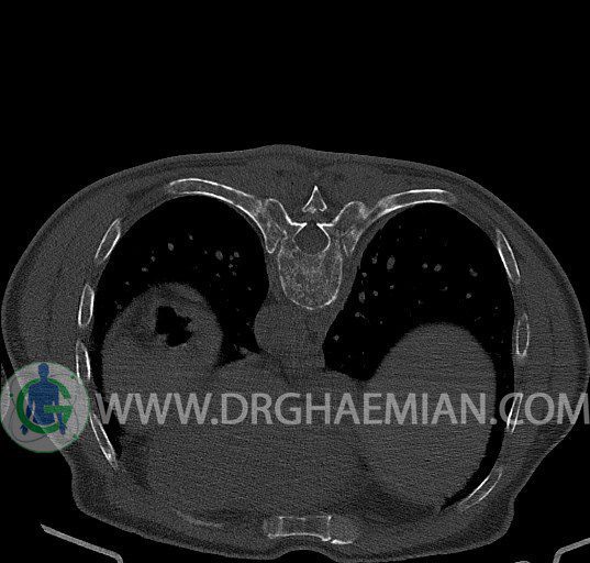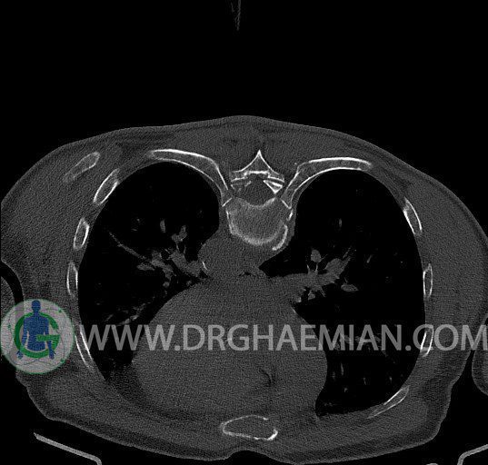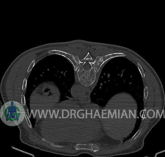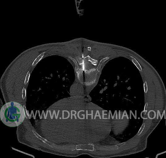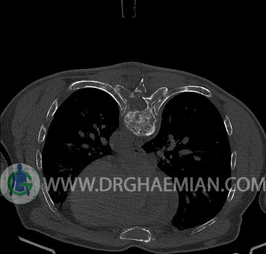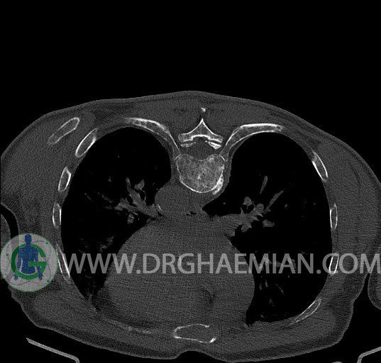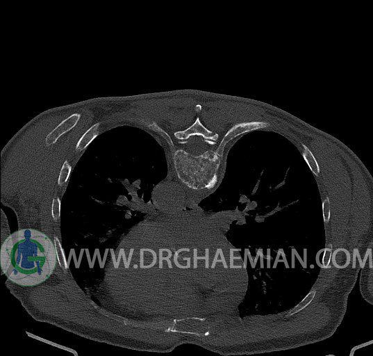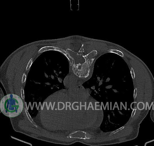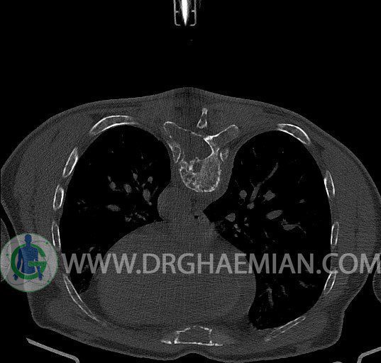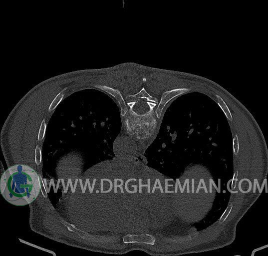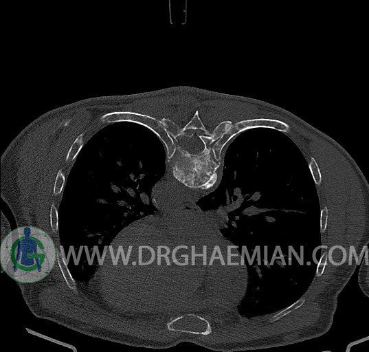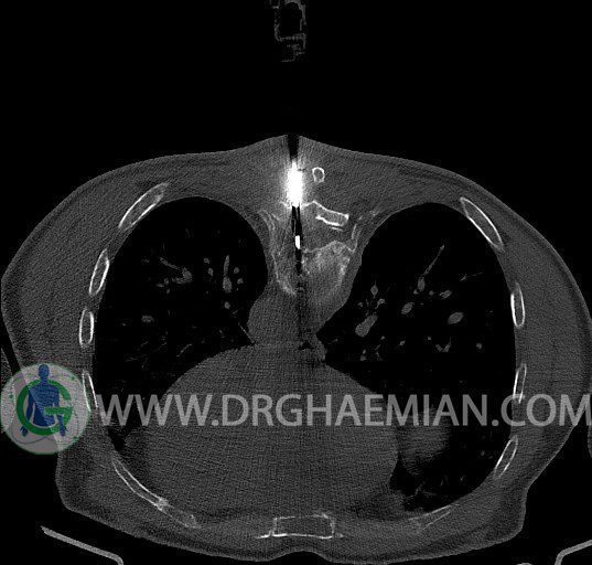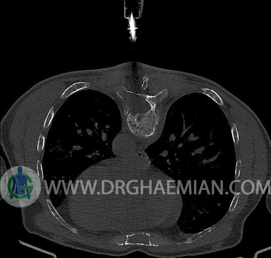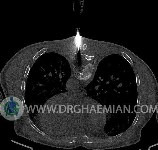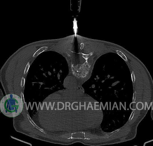 نمونه برداری تحت گاید سی تی اسکن از دستگاه سی تی اسکن (نوعی خاص از رادیولوژی که با کامپیوتر انجام می شود) برای یافتن ناحیه غیرعادی در بدن و به برداشتن نمونه از بافت آن ناحیه کمک می کند. در این کیس از توده مهره توراسیک بیمار نمونه برداری انجام شد.