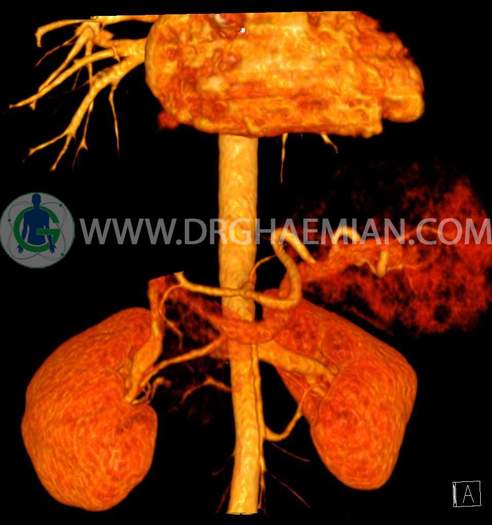 سی تی آنژیوگرافی (CTA) از طریق تزریق ماده حاجب (کنتراست) به داخل عروق خونی به هنگام سی تی اسکن، به تشخیص و ارزیابی بیماری عروق خونی یا عارضه هایی مرتبط مانند آنوریسم ها یا انسداد ها کمک می کند. در این کیس وازواسپاسم سرخرگ رودهبندی بالایی و آنوریسم شریان طحالی دیده می شود.