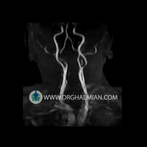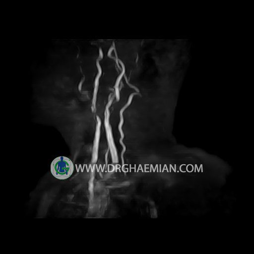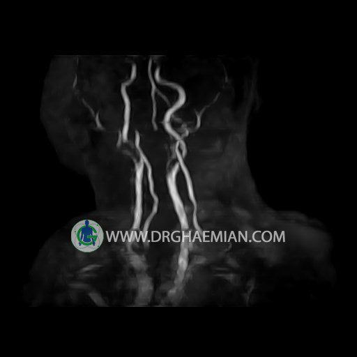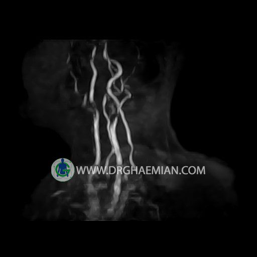 ام آر آنژیوگرافی با استفاده از آهنربایی قوی، امواج رادیویی و کامپیوتری هوشمند عروق خونی را ارزیابی کرده و به یافتن موارد غیرعادی کمک میکند. این تصویربرداری از تششعات استفاده نمی کند و ممکن است از کنتراست (ماده حاجب) استفاده شود. در این کیس تنگی آترواسکلروتیک گردن بیمار مشاهده می شود.
