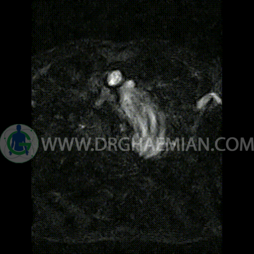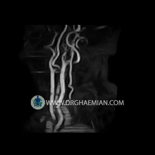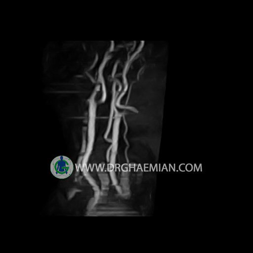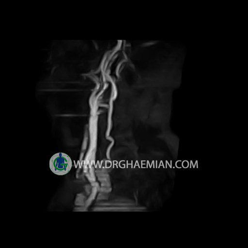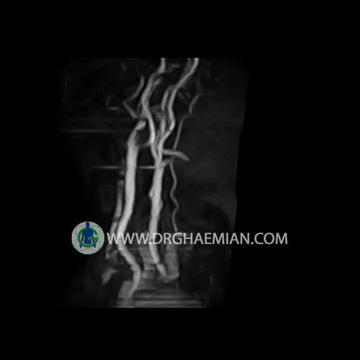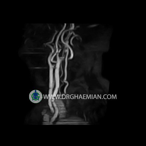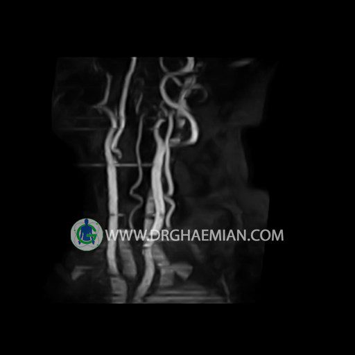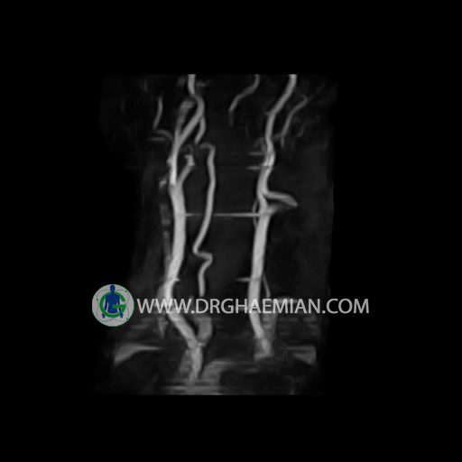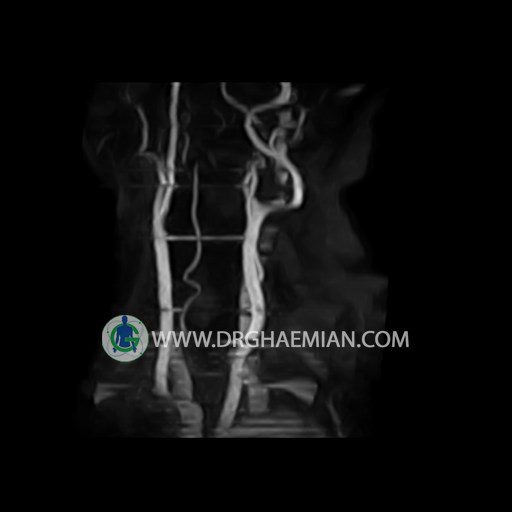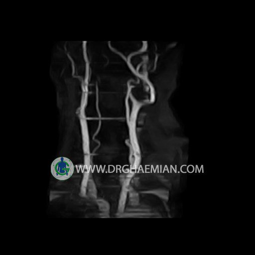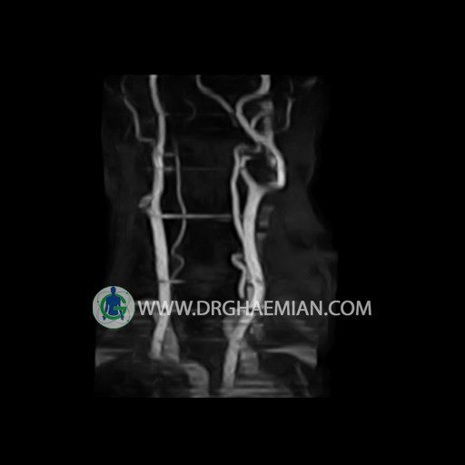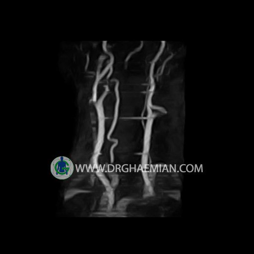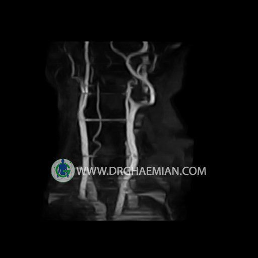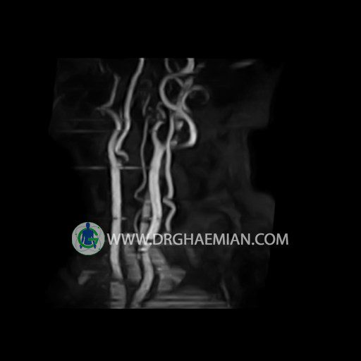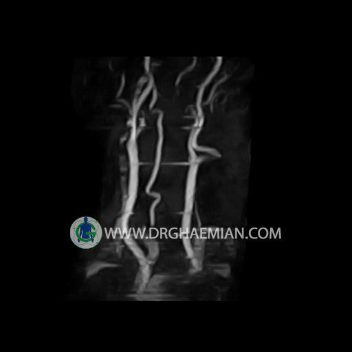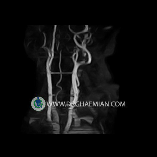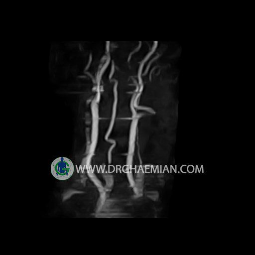 ام آر آنژیوگرافی با استفاده از آهنربایی قوی، امواج رادیویی و کامپیوتری هوشمند عروق خونی را ارزیابی کرده و به یافتن موارد غیرعادی کمک میکند. این تصویربرداری از تششعات استفاده نمی کند و ممکن است از کنتراست (ماده حاجب) استفاده شود. در این کیس پلاک های آترواسکلروتیک گردن و باریک شدن مشاهده می شود.